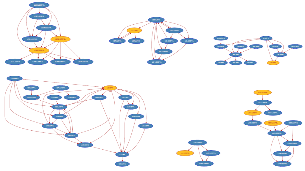 The cascade materializes in a graph the dynamics we described in the beginning: a group of bags causes high load between L1 and L2; this high load propagates forward “downstream” to (L4,L5) and then to (L5,L6). But the load at (L4,L5) is also follwoed by a blockage “upstream”.