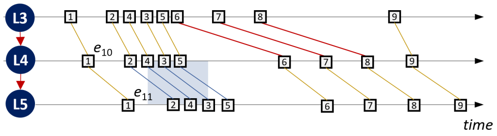 Second, we group all interval events by their (source,target) activity pair and order them by their start time. Technically, this can be as a new event log where the (source,target) pair is the case identifer. In our example, we group the interval events as follows: