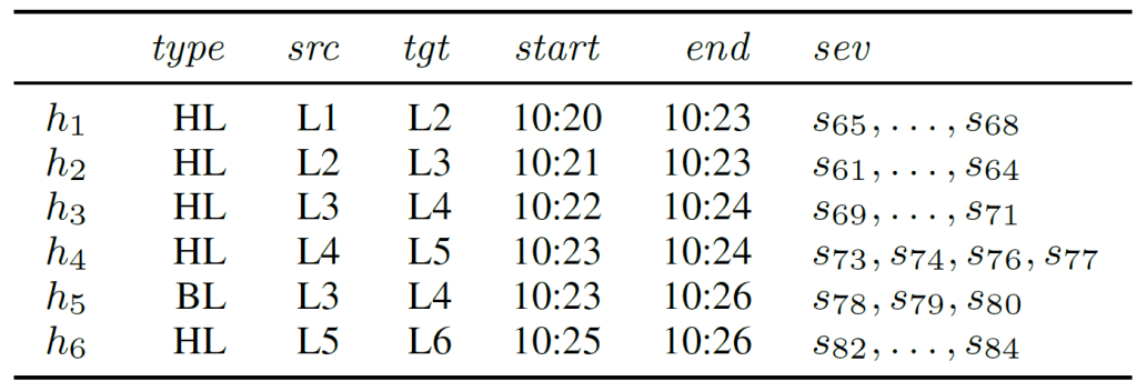 For example, in the system-level event log above, h4 and h5 overlap in time (10:23-10:24 and 10:23-10:26) and in space (L4). System-level events h5 and h6 overlap in time but not in space.