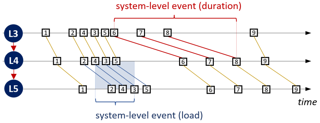 Such dynamics are common in physical processing system. The high load between L4 and L5 due to bags 2, 4, 3, 5 causes the bags 6 and 7 to be delayed. Below we discuss how to detect and describe such phenomena: by detecting emergent system-level events and correlating them into cascades.